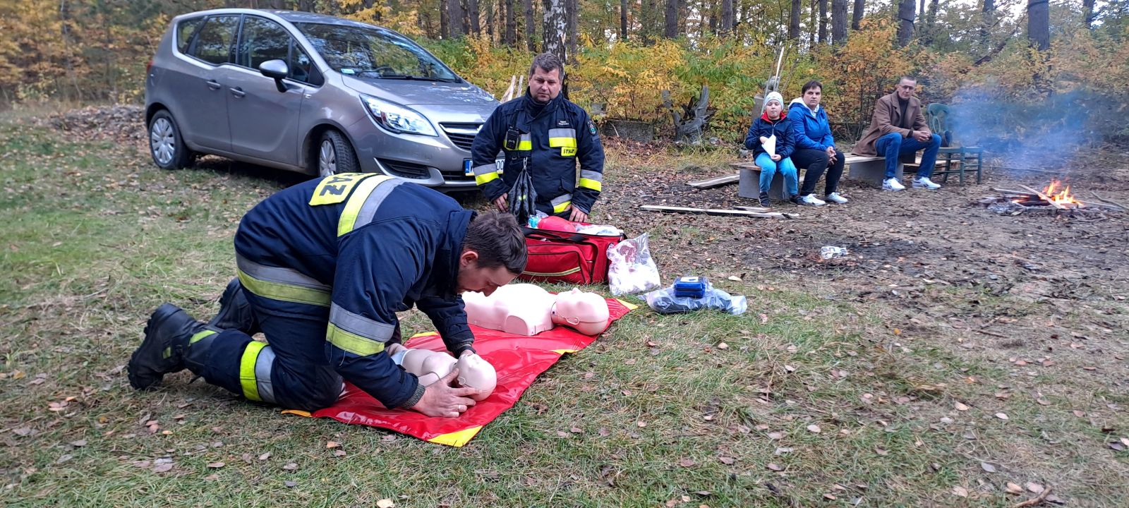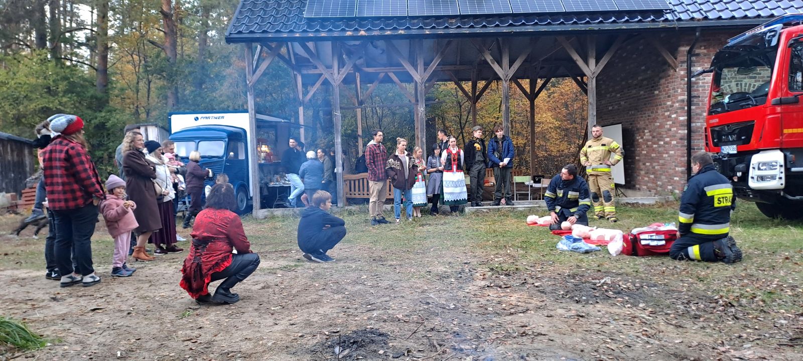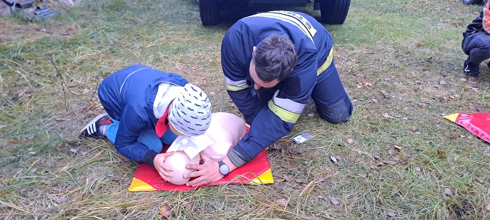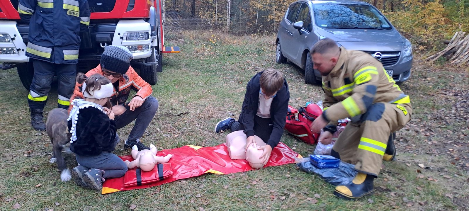 Na uczniów czekało wiele atrakcji, m.in.: pokaz działań straży pożarnej i policji, praktyczne ćwiczenia z udzielania pierwszej pomocy, ognisko z pieczonymi kiełbaskami, dmuchańce do skakania i maskotki SKO - Żyrafka Lokatka oraz Pancernik Hatetepes.