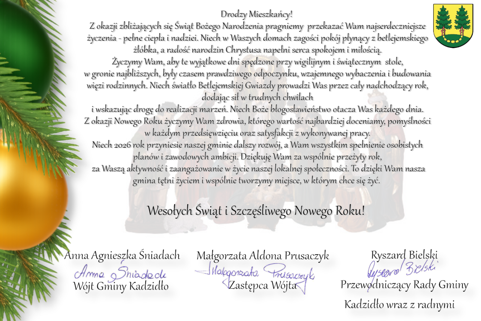 Informuję również, że zgodnie z art. 6e ust. 1 pkt 1 ustawy z dnia 20 maja 2016 r. o inwestycjach w zakresie elektrowni wiatrowych, w dniu 21 sierpnia 2025 r. o godz. 19:00 w siedzibie Urzędu Gminy Kadzidło , ul. Targowa 4 odbędzie się spotkanie otwarte, w formie spotkania bezpośredniego, dotyczące rozwiązań możliwych do ujęcia w planie miejscowym.