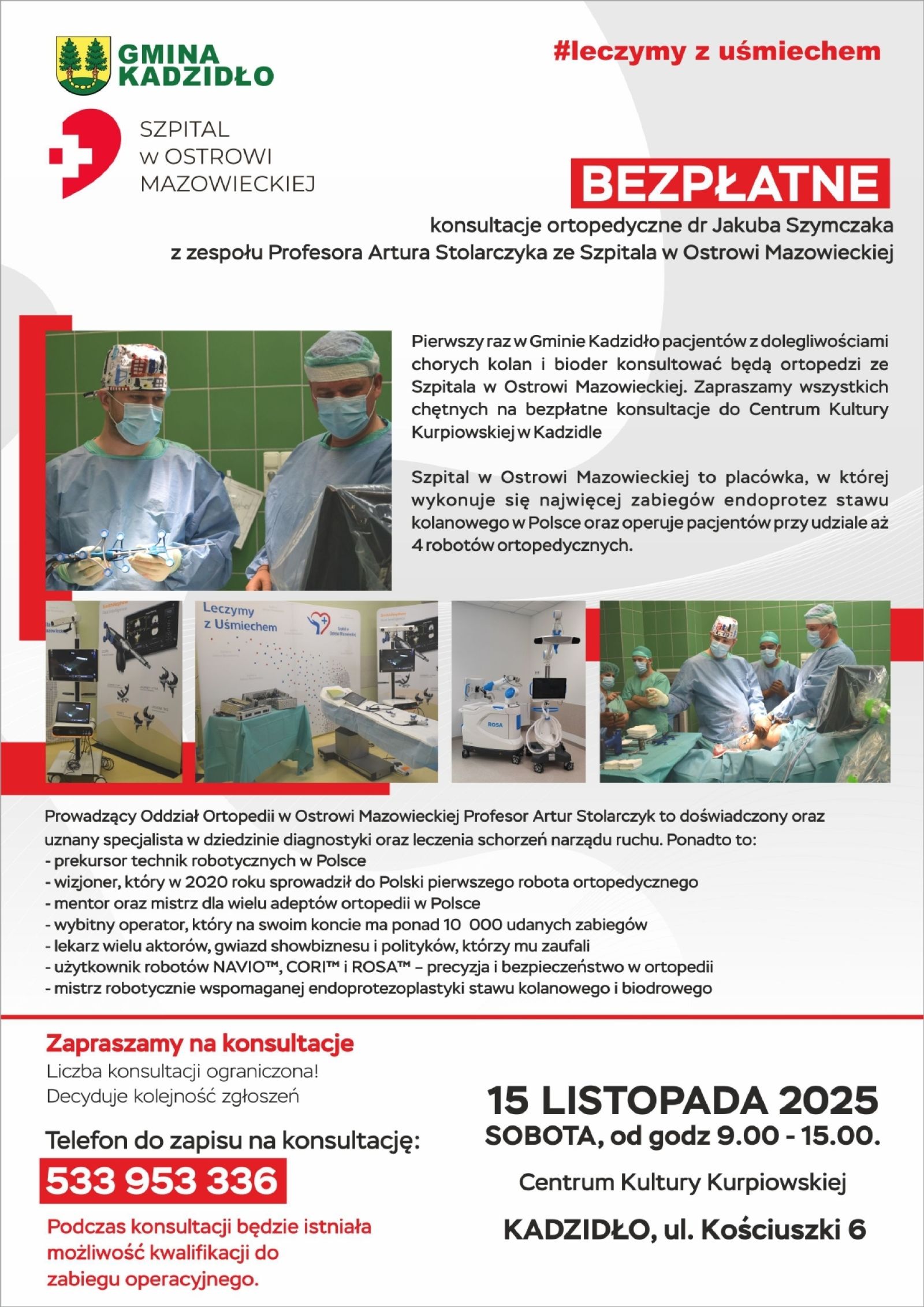 Gmina Kadzidło oraz Szpital w Ostrowi Mazowieckiej zapraszają na BEZPŁATNE konsultacje ortopedyczne dr. Jakuba Szymczaka z zespołu Profesora Artura Stolarczyka ze Szpitala w Ostrowii Mazowieckiej