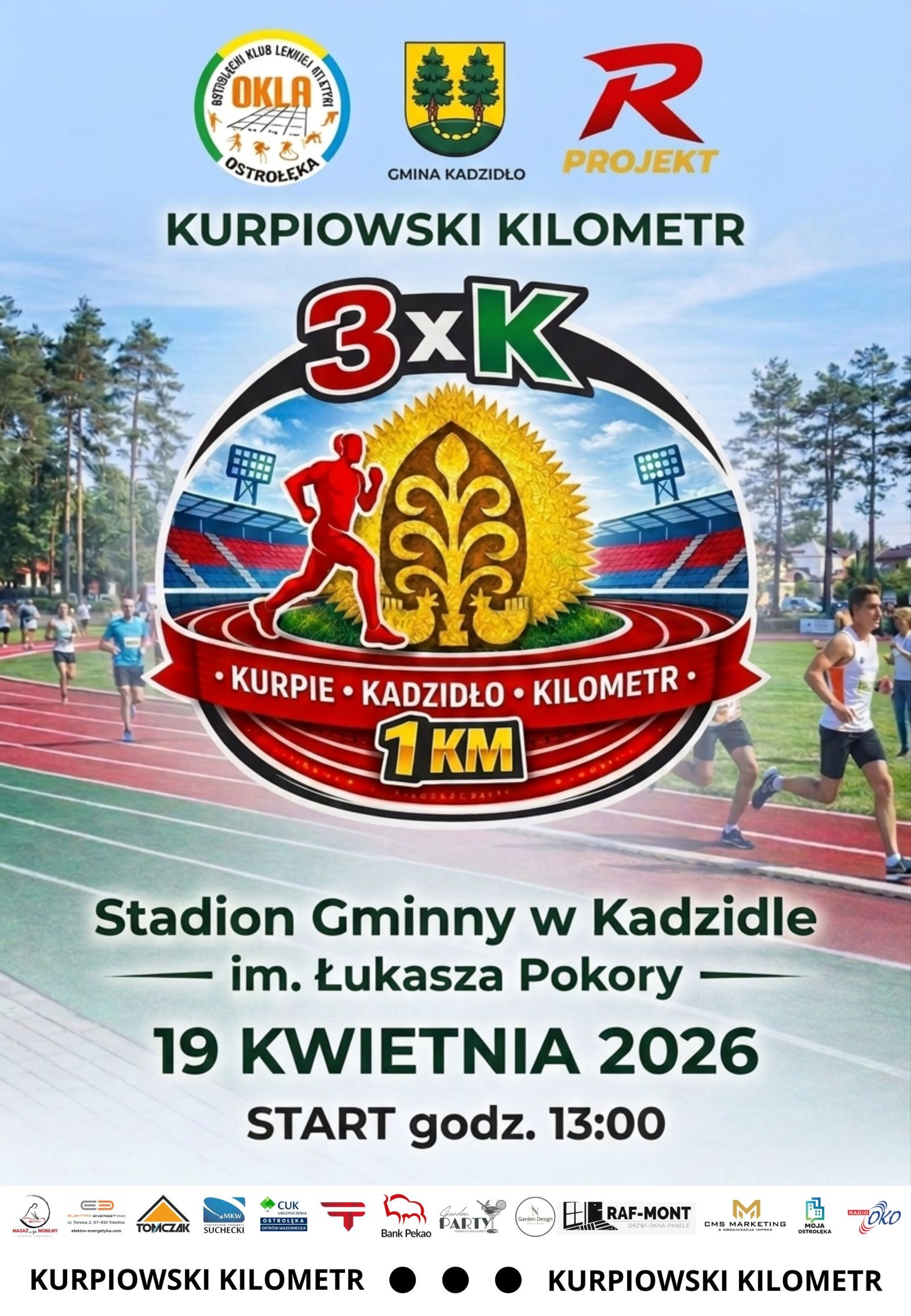 Już 19 kwietnia 2026 roku na Stadionie Gminnym w Kadzidle im. Łukasza Pokory odbędzie się pierwsza edycja wydarzenia sportowego pn. 3 x K KURPIE KADZIDŁO KILOMETR czyli Kurpiowski Kilometr dla każdego.